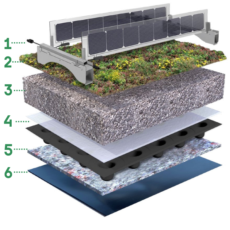 De zonnepanelen zijn geschikt voor daken met een lichte helling, tot maximaal 5 graden. Dankzij de verticale opstelling en de ruime tussenruimte wordt het groendak niet beschadigd en blijft de biodiversiteit behouden.